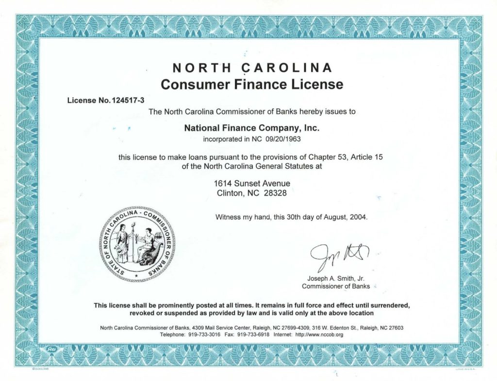 We are licensed and supervised by the North Carolina Banking Department and in good standing with the North Carolina Secretary of State. All loans are supervised under the NC Consumer Finance Act, with amounts from $1,250 to $5,000 and repayment terms of 12 to 48 months. Every loan includes: