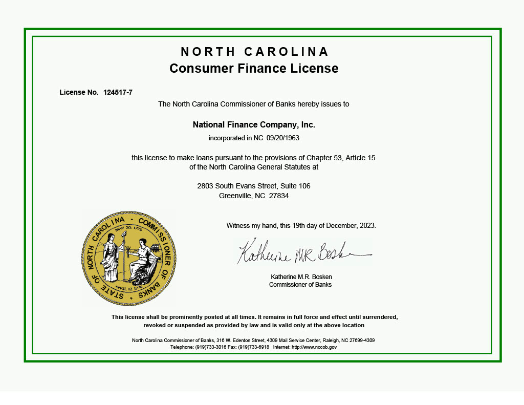 Trustworthy lending starts with transparency. NFC Greenville is licensed and supervised by the North Carolina Department of Banking and is in good standing with the NC Secretary of State. Every loan we make follows the North Carolina Consumer Finance Act.