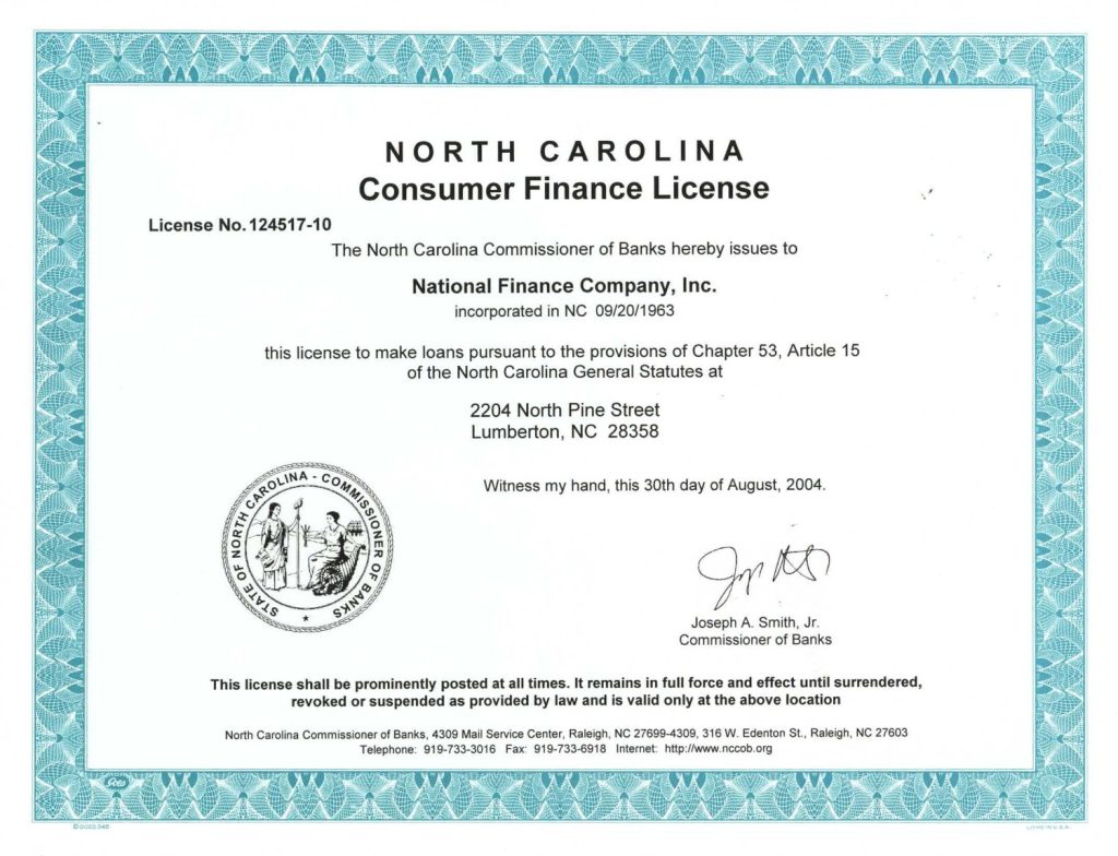 At National Finance Company, integrity is at the heart of everything we do. We’re fully licensed and supervised by the North Carolina Banking Department and remain in good standing with the NC Secretary of State. Our loans follow all guidelines under the North Carolina Consumer Finance Act.